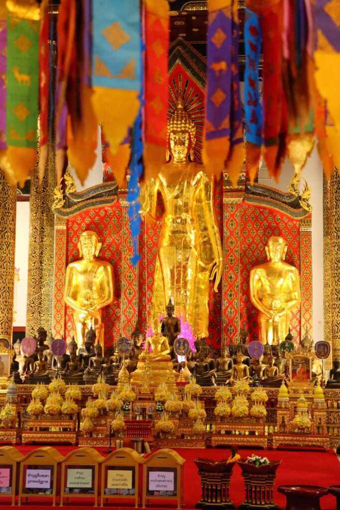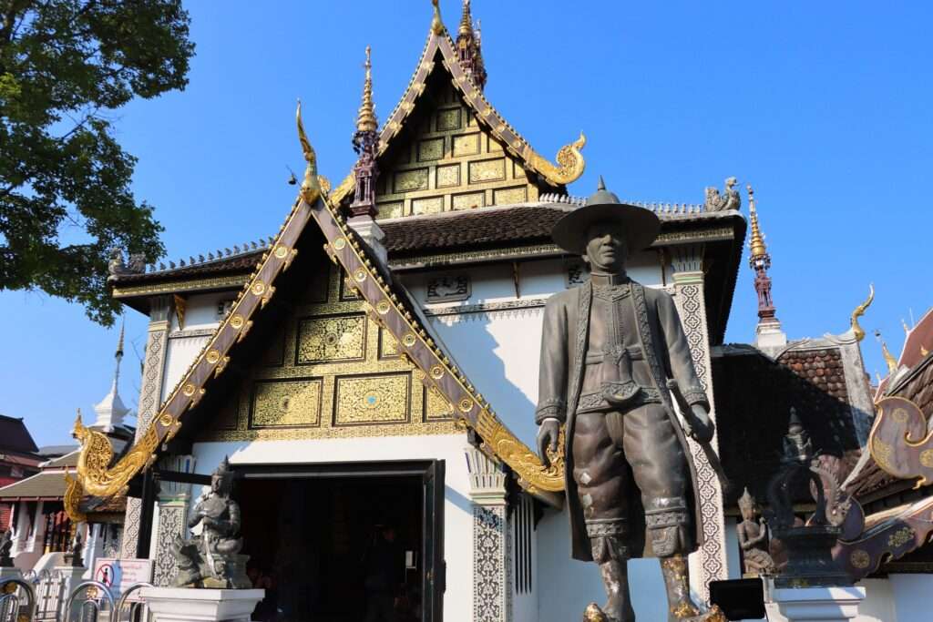 Dans un autre pavillon, un moine vénéré repose dans une châsse de verre, entouré d’offrandes. Nous apprécions la finesse des boiseries, les motifs dorés, les fleurs fraîches. Ce lieu rappelle que la spiritualité Lanna ne se limite pas aux grandes figures du bouddhisme : elle honore aussi les maîtres locaux, les guides, les sages.