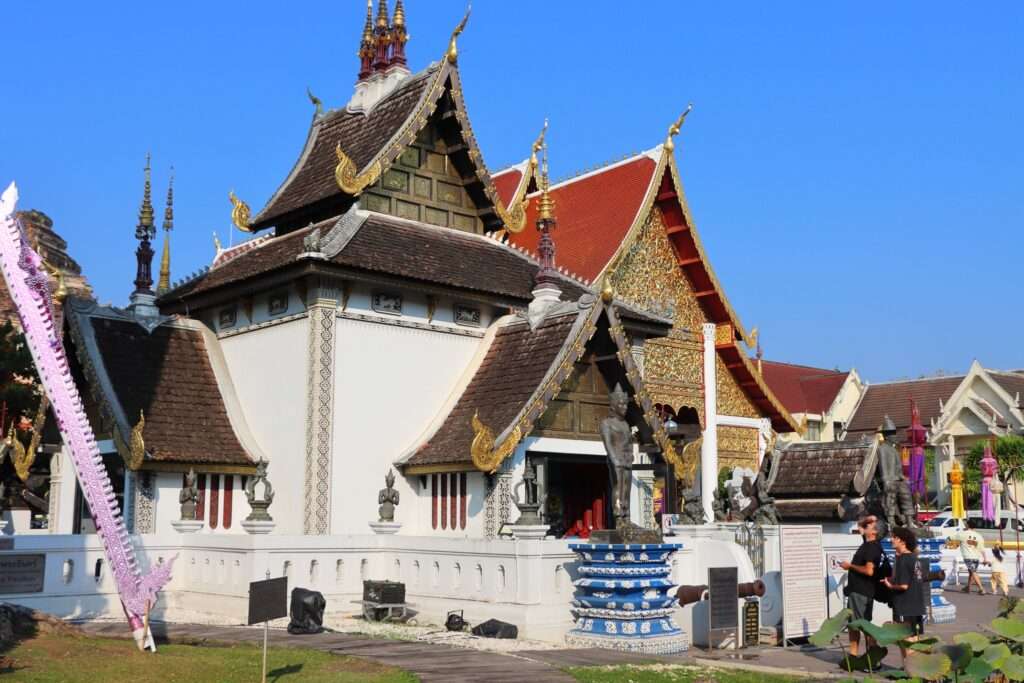 Les lanternes colorées, les statues protectrices, les lions et les nagas qui gardent les entrées, les façades sculptées où l’or et le rouge se répondent. Chaque détail raconte un fragment de la spiritualité Lanna, où la beauté n’est jamais décorative mais toujours signifiante.
