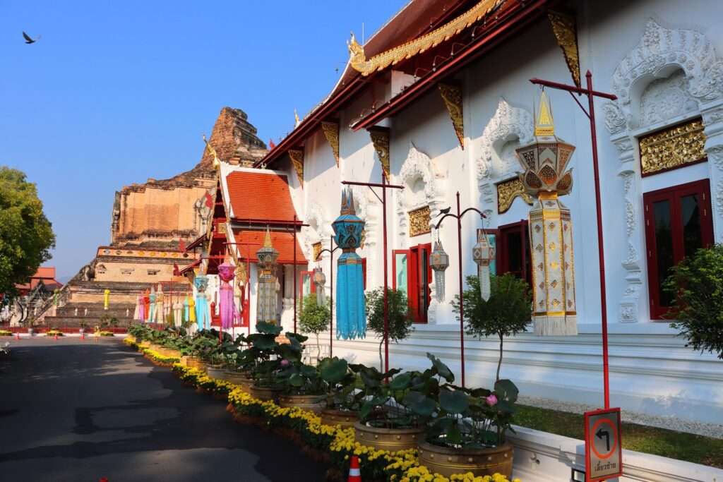 Quitter le Wat Panthao pour rejoindre le Wat Chedi Luang à pied, c’est traverser une frontière invisible. La vieille ville de Chiang Mai se déploie comme un tissu vivant : maisons en teck, cafés encore assoupis, drapeaux de prières qui frémissent au-dessus des ruelles, parfums de fleurs et d’encens portés par le vent. Cette marche lente prépare l’esprit. Elle ouvre un espace intérieur, une disponibilité, avant d’atteindre l’un des sanctuaires les plus puissants de la cité Lanna.