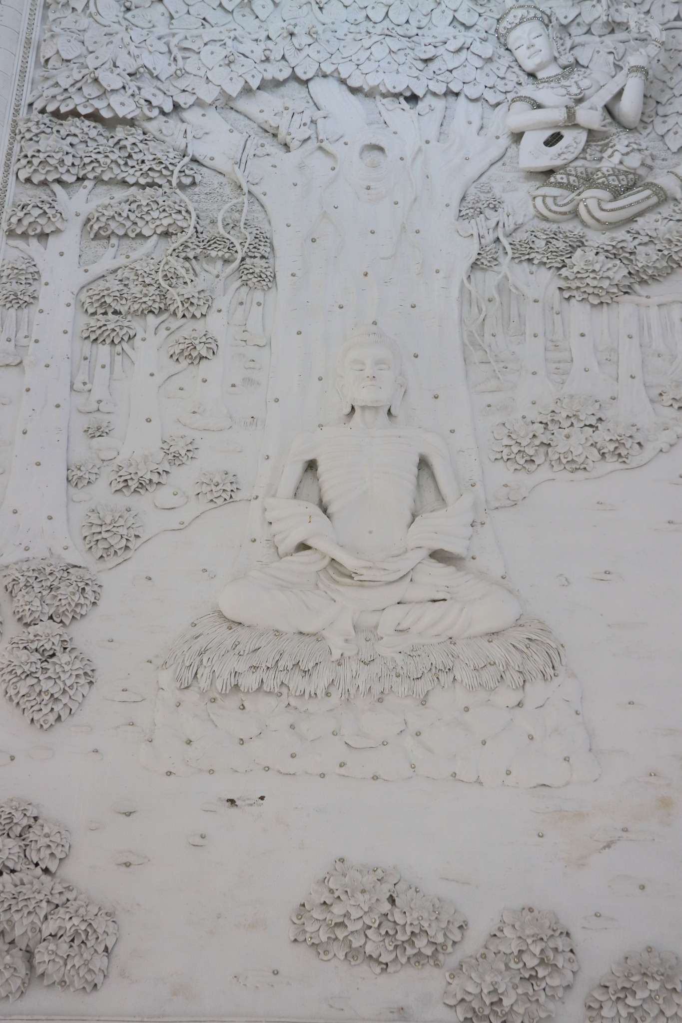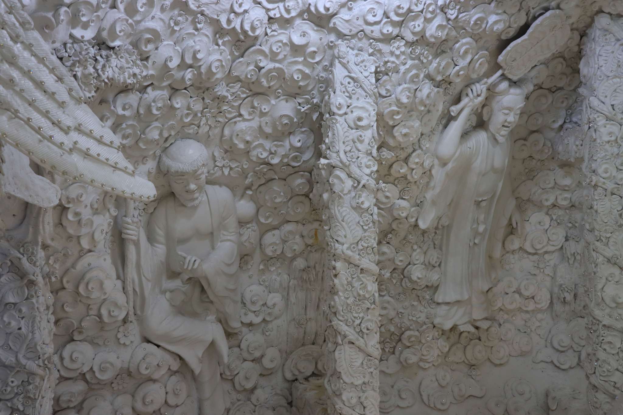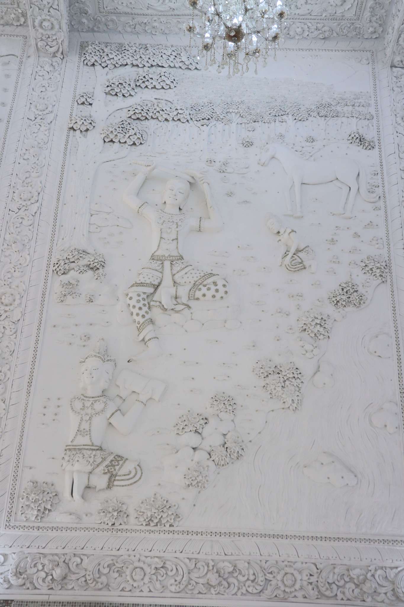 Bien que récent, ce temple s’inscrit pleinement dans la continuité des traditions bouddhistes du Nord. En observant ses façades, nous découvrons des bas-reliefs d’une finesse remarquable : scènes mythologiques, épisodes de la vie du Bouddha, représentations du cycle de la naissance, de la souffrance et de la mort. Ces sculptures nous ramènent sans cesse à la philosophie bouddhiste de l’impermanence. À l’intérieur, la blancheur immaculée se prolonge : colonnes décorées de motifs floraux, plafonds ornés de lustres, statues de Bouddha qui imposent le silence et la lenteur. Nous avançons presque instinctivement plus doucement, comme si le lieu nous imposait son propre rythme.