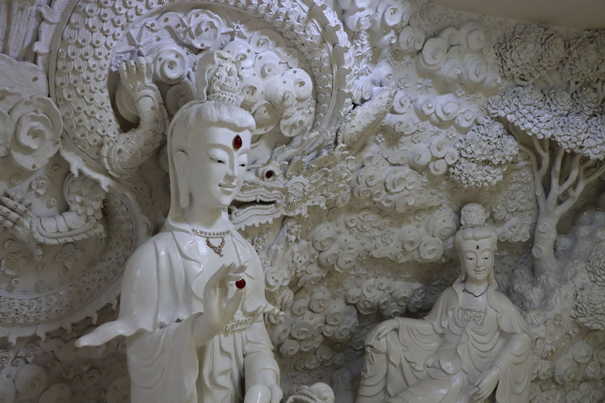 Face à la pagode et à la statue monumentale de Guan Yin, le grand temple blanc s’impose à nous comme un écrin de lumière. Sa blancheur éclatante, presque aveuglante sous le soleil, nous donne l’impression d’entrer dans un sanctuaire façonné dans la pureté même. En gravissant les escaliers, encadrés par des dragons sinueux aux formes protectrices, nous avons le sentiment d’être guidés vers un espace sacré, à l’écart du tumulte du monde.