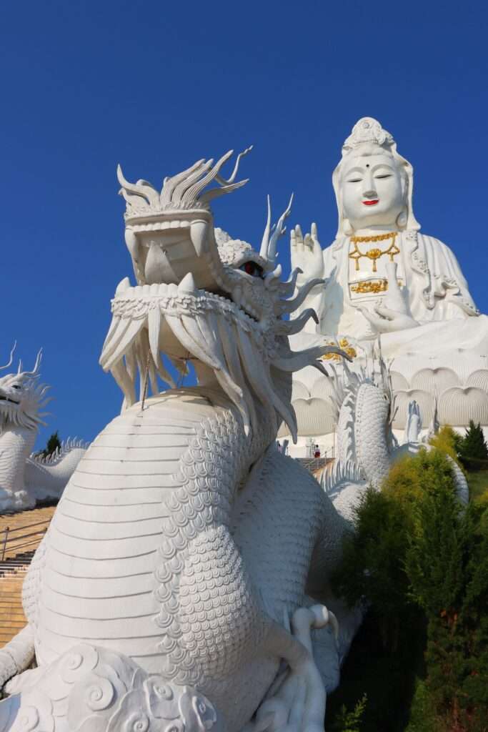 En redescendant, nous prenons le temps de parcourir l’ensemble du complexe, et nous sentons combien le Wat Huay Pla Kang est un lieu de rencontre entre les cultures. Sous nos pas, les influences thaïes, chinoises et birmanes se répondent sans jamais se contredire. Le grand temple blanc capte la lumière et la renvoie presque violemment, tandis que ses dragons sinueux semblent onduler le long des escaliers, comme s’ils étaient vivants. Un peu plus loin, la pagode à neuf niveaux s’élève, verticale et puissante, protégée par des créatures mythologiques qui montent la garde. En circulant entre ces bâtiments, nous ressentons physiquement ce dialogue entre le bouddhisme Theravada et le Mahayana, entre sagesse méditative et compassion universelle. Ici, la spiritualité ne se vit pas à plat : elle se vit en hauteur. Nous montons, nous nous arrêtons, nous respirons, nous observons, comme si chaque pas nous rapprochait un peu plus du ciel.
