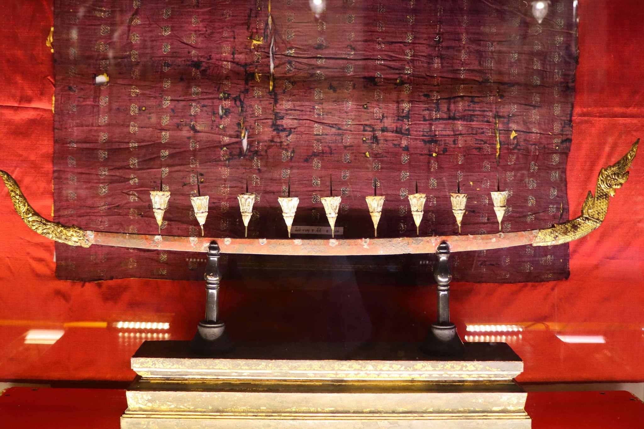 À l’avant, deux sculptures intriguent : un éléphant et un cheval, objets royaux utilisés par le vice-roi Singhanat pour l’aumône. Offerts au Bouddha en signe de dévotion, ils rappellent que même les symboles du pouvoir terrestre peuvent se mettre au service du sacré. Ces animaux, associés à la force et à la vitesse, deviennent ici des vecteurs d’offrande, des médiateurs entre le monde royal et le monde spirituel.