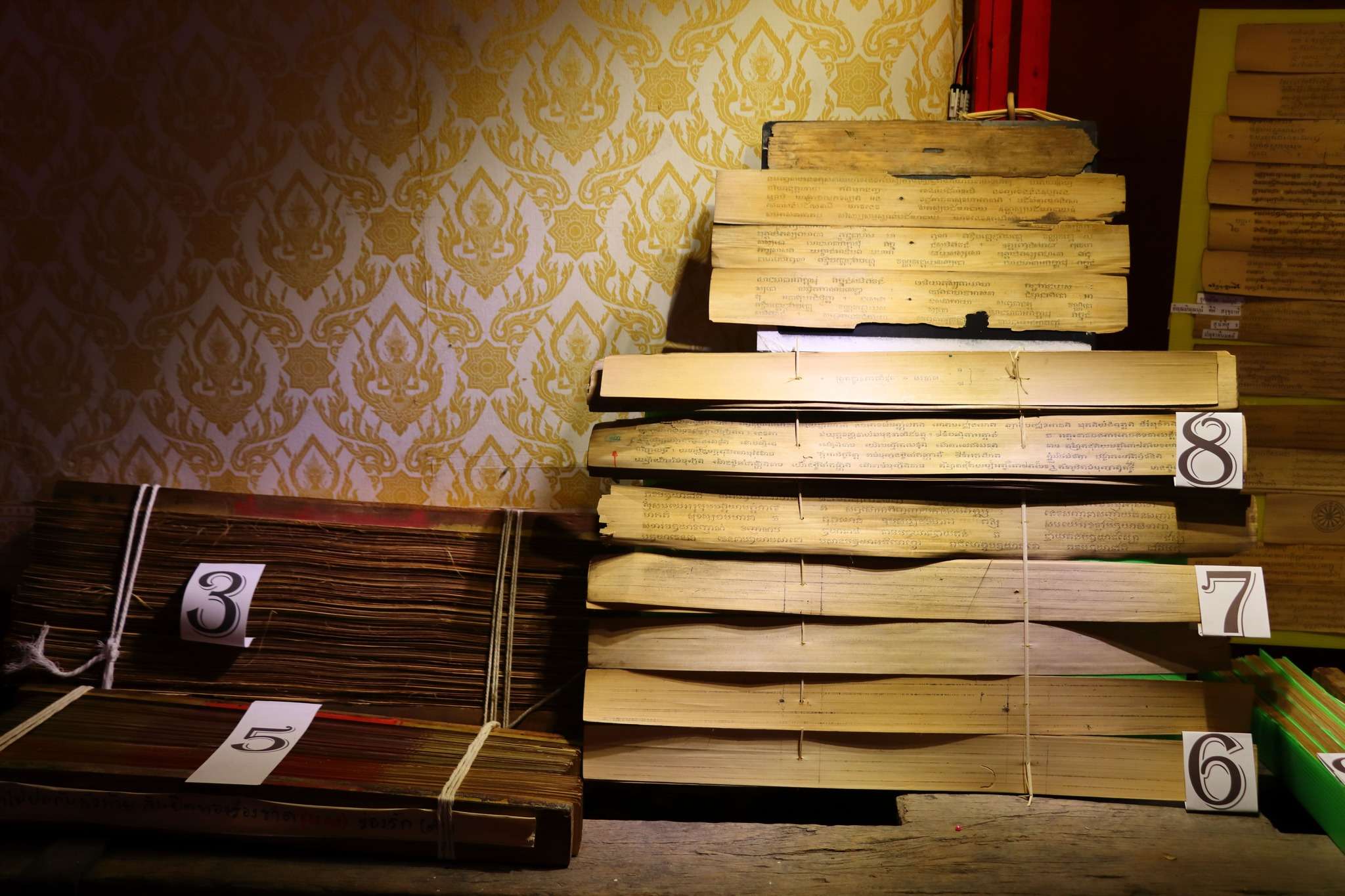 Nous poursuivons notre visite vers le bâtiment opposé, quittant l’ombre dense du Phra Ubosot pour longer une cour où le silence se fait encore plus profond. À proximité, une bibliothèque aux boiseries patinées nous attire par son aura discrète. Derrière ses portes, des manuscrits anciens reposent sur des feuilles de palmier, soigneusement conservés depuis des générations. L’air y est imprégné d’un parfum subtil d’encens et de papier ancien, comme si chaque page portait encore la mémoire des siècles. Dans ce lieu, le savoir est sacré : c’est ici que fut fondée en 1889 la Mahachulalongkornrajavidyalaya, première université bouddhiste de Thaïlande. Les étudiants-moines y poursuivent encore aujourd’hui l’étude de la philosophie, du Pali et des rituels anciens, perpétuant une tradition intellectuelle qui fait de Wat Mahathat un centre spirituel autant qu’un foyer de connaissance.