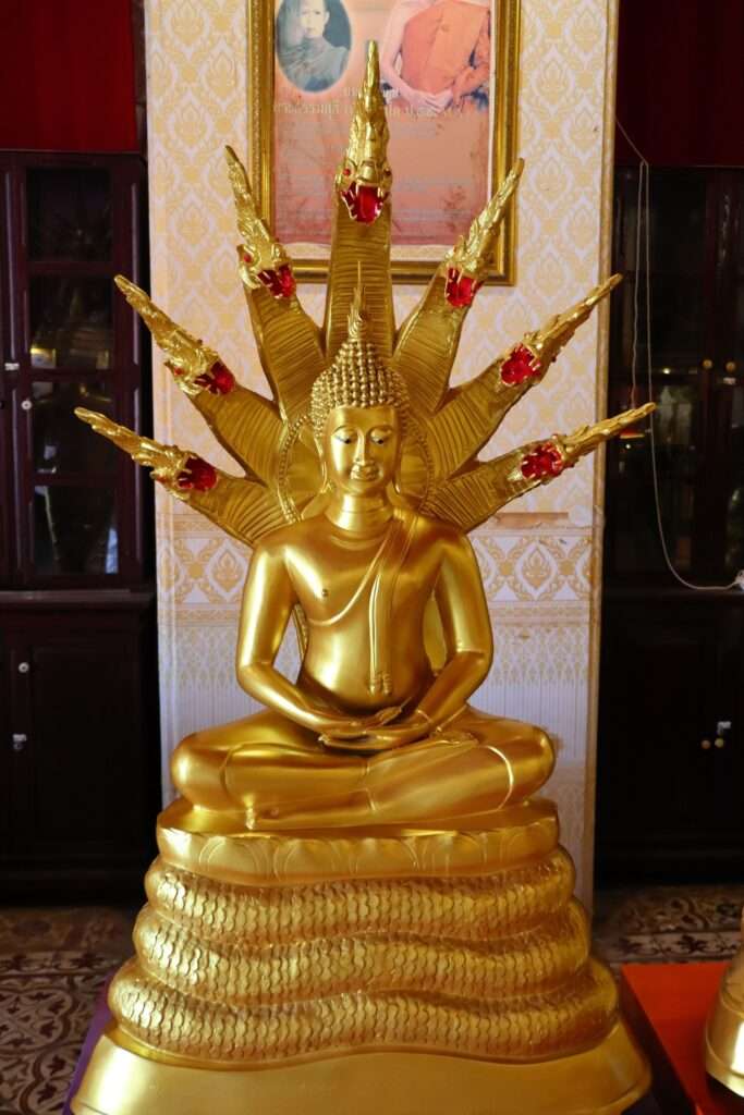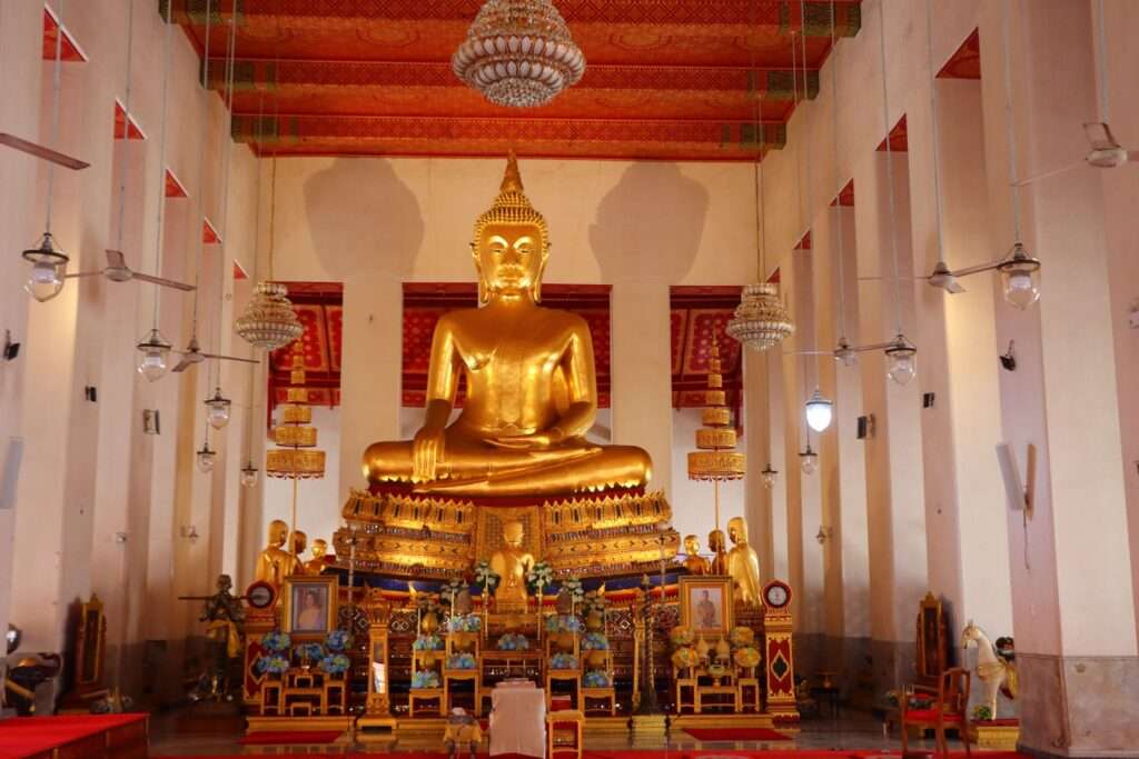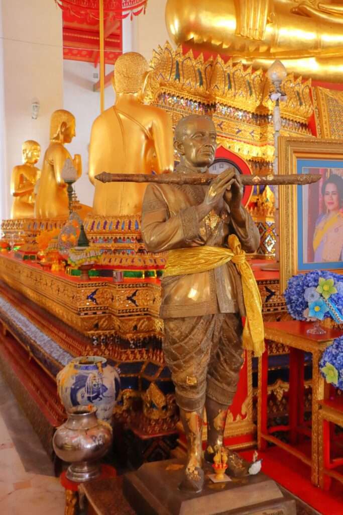 Le sanctuaire se déploie ensuite vers la chapelle principale, construite en 1783 par le vice-roi Maha Sura Singhanat, en même temps que l’ordination hall et le Phra Mondop. Restaurée sous Rama V, elle arbore un fronton orné du coronet princier, symbole éclatant du patronage royal. En franchissant son seuil, nous découvrons un espace où l’or et la pierre dialoguent. Cinq grandes statues de Bouddha se dressent, représentant les quatre Bouddhas passés et le Bouddha futur. Le principal, au centre, fut façonné en briques et mortier par Phraya Devarangsan, artisan du Palais de l’Avant sous Rama I.