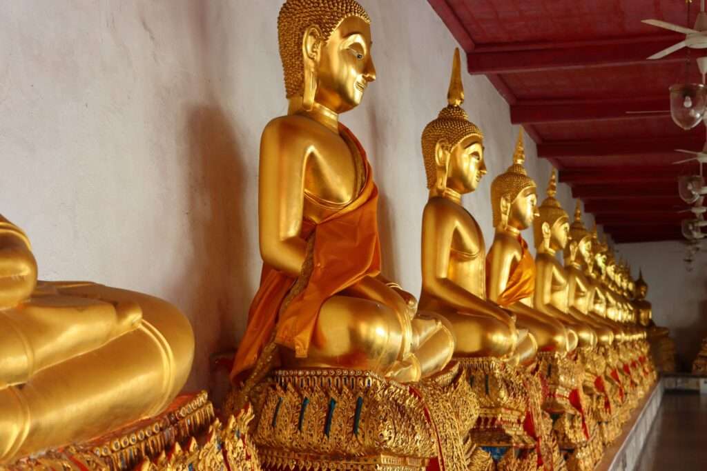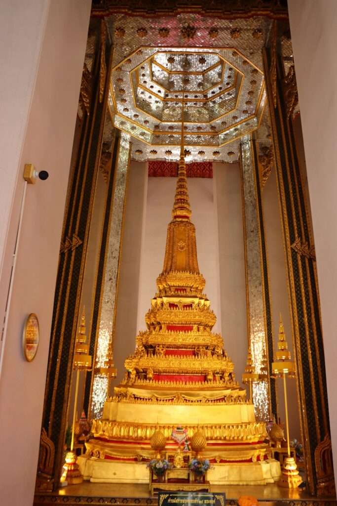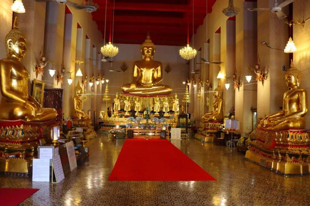 En franchissant les portes de Wat Mahathat Yuwaratrangsarit, nous sommes immédiatement saisis par une atmosphère de calme et de solennité. Le tumulte de Bangkok s’efface derrière nous, remplacé par le silence des galeries qui s’étendent autour de la cour intérieure.