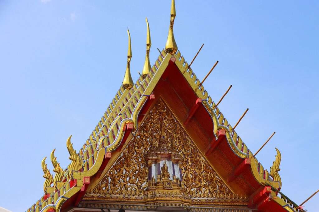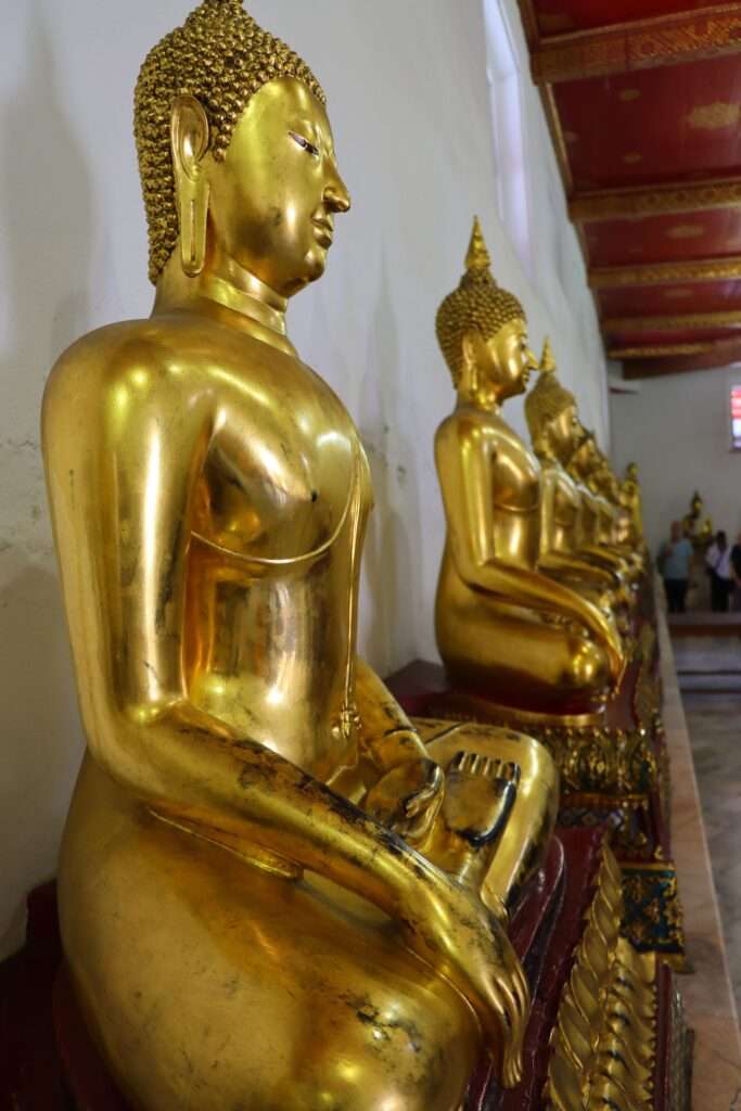 Enfin, l’architecture elle-même raconte une histoire. Sur votre photo (00041658.JPG), l’une des entrées du cloître révèle un fronton richement décoré, typique du style Bangkok, où fleurs de céramique et dorures à la feuille d’or scintillent sous la lumière. À l’entrée, les lions gardiens de pierre, d’influence chinoise, veillent silencieusement, repoussant les mauvais esprits. Et si les Bouddhas brillent encore aujourd’hui, c’est grâce aux fidèles qui recouvrent régulièrement leurs statues de nouvelles feuilles d’or, perpétuant un geste de dévotion qui leur donne cet éclat incroyable malgré les siècles.