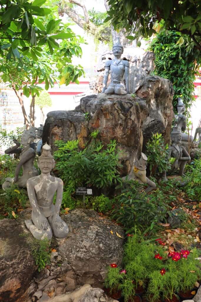 Dans les jardins intérieurs de Wat Pho, la promenade prend une dimension inattendue. Entre les chedis et les orchidées, surgissent les Khao Mor, ces reconstitutions miniatures de montagnes sacrées. Leur silhouette de pierre, façonnée avec soin, évoque les paysages mythiques où les ermites se retiraient pour méditer. Autour et sur ces reliefs miniatures, se dressent les statues des ruesi, figures ascétiques qui incarnent la connaissance, la maîtrise du corps et de l’esprit.