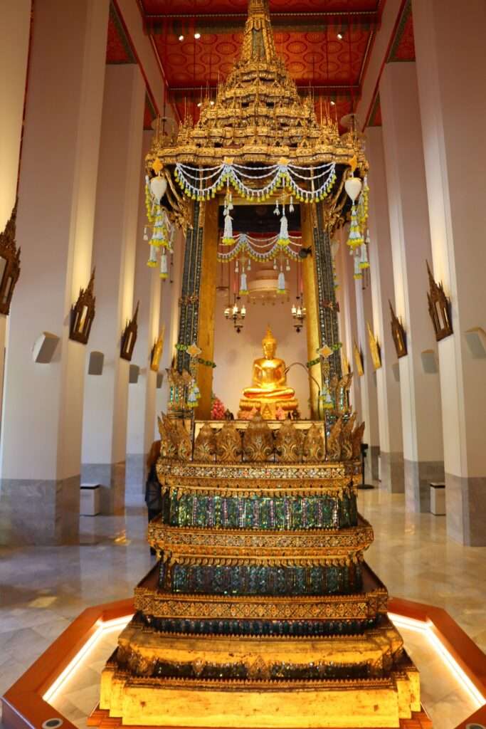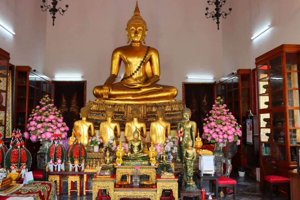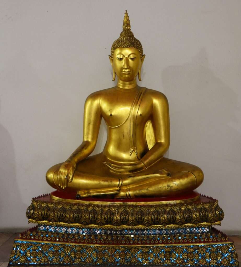 En entrant, le regard est immédiatement attiré par le Phra Buddha Theva Patimakorn, l’image principale du temple. Assis en posture de méditation, dans le geste de l’« appel de la Terre à témoin » (bhumisparsha mudra), il incarne le moment où Bouddha atteint l’éveil. Cette statue royale, datant du début de l’ère Rattanakosin et associée au règne de Rama Ier, est considérée comme le véritable protecteur de Wat Pho, bien avant que le célèbre Bouddha couché ne devienne l’icône du lieu.