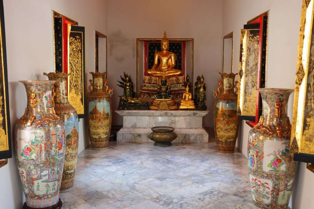 Autour de lui, tout concourt à la solennité et à l’équilibre. Les grandes jarres et vases en porcelaine chinoise, finement décorés, rappellent les échanges commerciaux du XVIIIᵉ et XIXᵉ siècle, lorsqu’ils arrivaient à Bangkok comme lest des jonques. Les panneaux laqués et dorés, ornés de motifs floraux et symboliques, enveloppent l’espace d’une lumière sacrée. Les statues secondaires, disciples et divinités protectrices, veillent discrètement, rappelant que l’enseignement du Bouddha est collectif et que la protection spirituelle est partagée. Le sol de marbre blanc, d’une pureté éclatante, accentue la symétrie et la solennité du sanctuaire, invitant à la méditation et au recueillement.