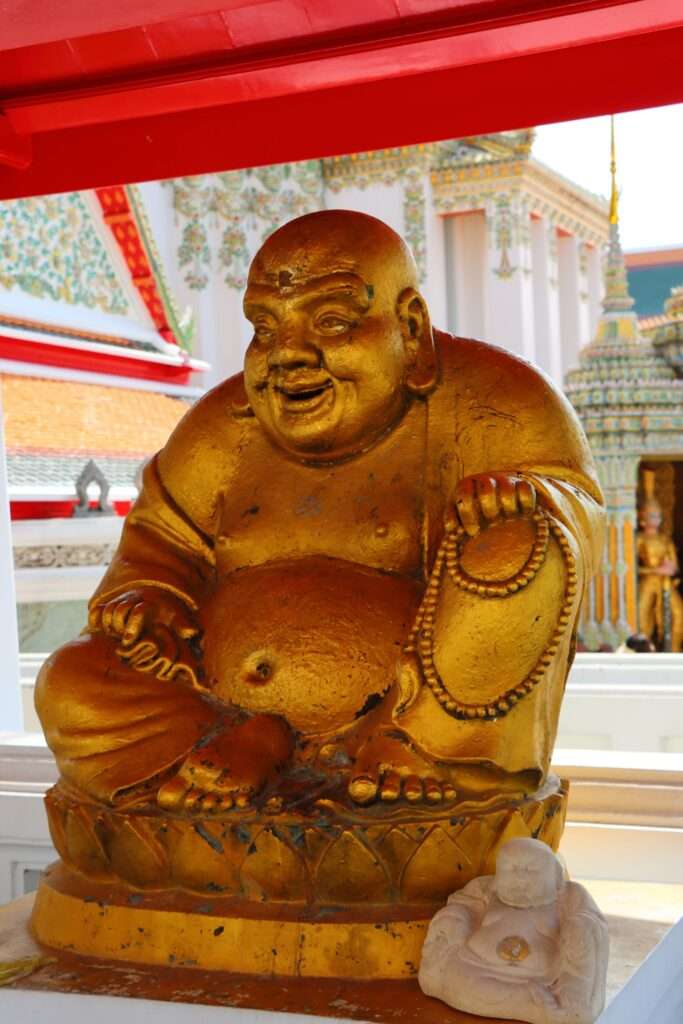 Dans ce décor, la présence des Bouddhas rieurs, parfois dorés et parfois sculptés dans la pierre blanche, apporte une touche de joie et de prospérité. Leur sourire généreux, hérité du bouddhisme chinois, témoigne de la fusion culturelle sino-thaïe. Le contraste entre les figures monumentales et les versions plus modestes crée une atmosphère complice, presque familiale, où la solennité se mêle à la légèreté.