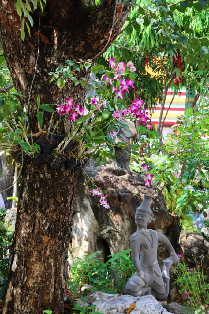 Mais Wat Pho ne se limite pas à cette verticalité majestueuse. Entre les chedis, de petits jardins s’épanouissent, plantés d’arbres, de fleurs tropicales et notamment d’orchidées, dont les couleurs délicates contrastent avec l’éclat minéral des stupas. Ces espaces verts ne sont pas de simples ornements : ils incarnent l’idée bouddhiste d’harmonie entre nature et spiritualité. Les fleurs, par leur fragilité, rappellent l’impermanence de toute chose, tandis que les arbres offrent ombre et fraîcheur, invitant à la méditation.