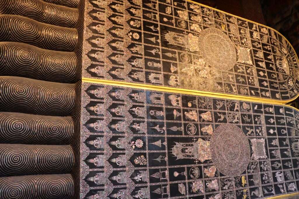 Le corps du Bouddha, long de quarante-six mètres, semble flotter dans la pénombre dorée du vihara. Les feuilles d’or qui recouvrent la statue captent la lumière comme une peau vivante, et l’on perçoit presque la chaleur qu’elles renvoient. La tête repose sur une main délicatement sculptée, le visage apaisé, les paupières mi-closes, comme si le Bouddha contemplait encore le monde tout en s’en détachant. Les pieds, immenses, attirent naturellement le regard : incrustés de nacre, ils dévoilent cent huit symboles auspicieux, une véritable cosmologie en miniature.