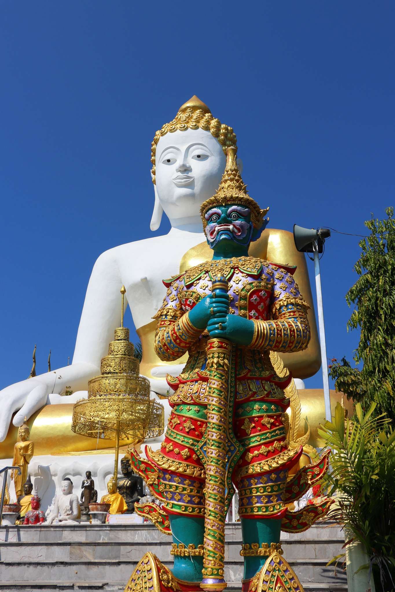 Le sanctuaire est aussi un véritable paysage de statues, chacune porteuse d’un rôle et d’une signification. Le grand Bouddha blanc et or, assis dans une posture de méditation, semble veiller sur la vallée avec une douceur presque humaine. Autour de lui, d’autres Bouddhas incarnent la protection, la détermination ou la compassion, comme autant de réponses sculptées aux préoccupations humaines.