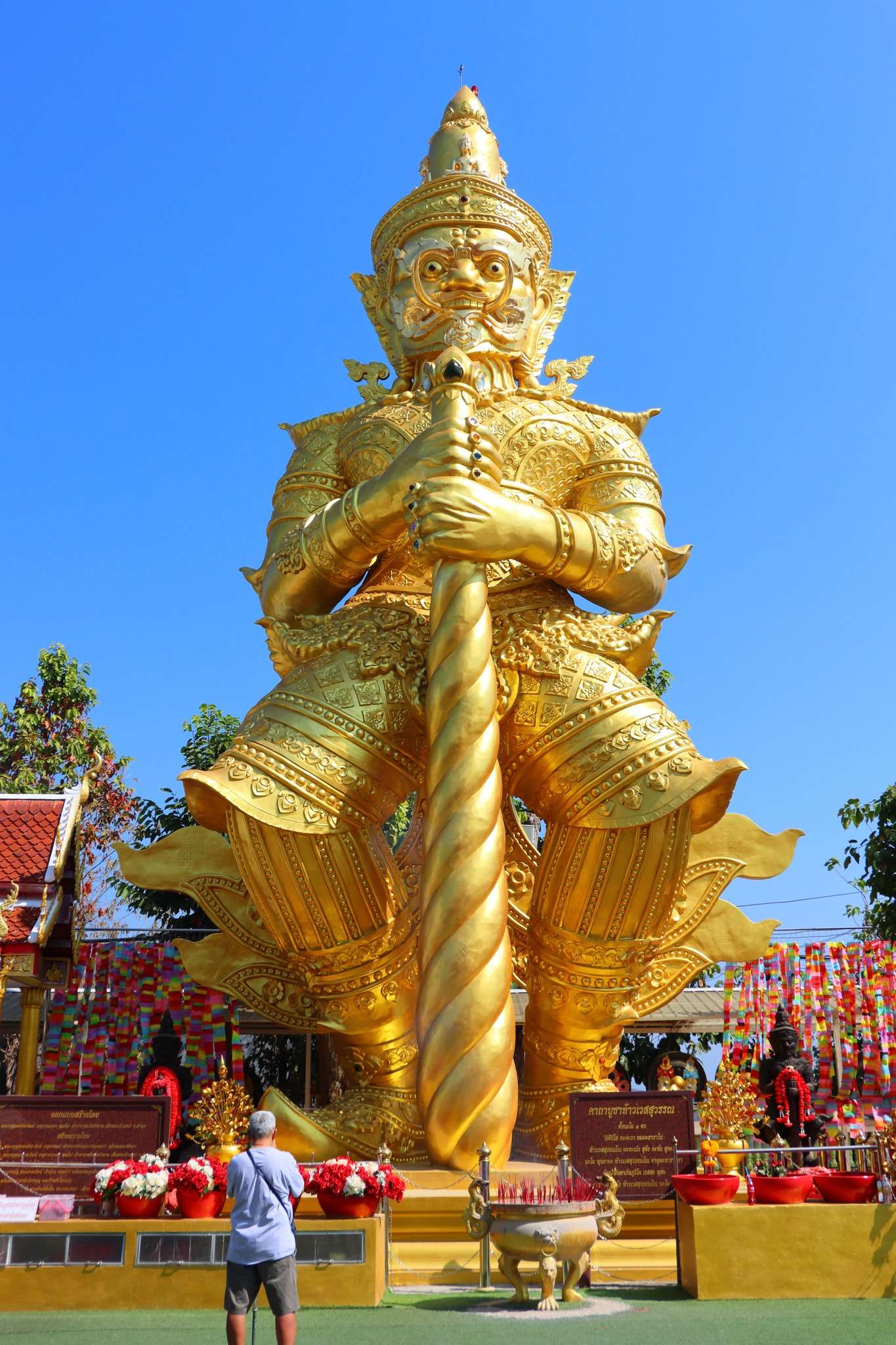 Dans la cour, un grand bouddha debout accueille les visiteurs, bras tendus et visage serein, posture rare qui incarne la prospérité et la bienveillance. Les viharns, aux toits superposés, sont ornés de motifs dorés et de sculptures de créatures mythologiques, tandis que les fresques intérieures racontent la vie du Bouddha et les légendes locales.