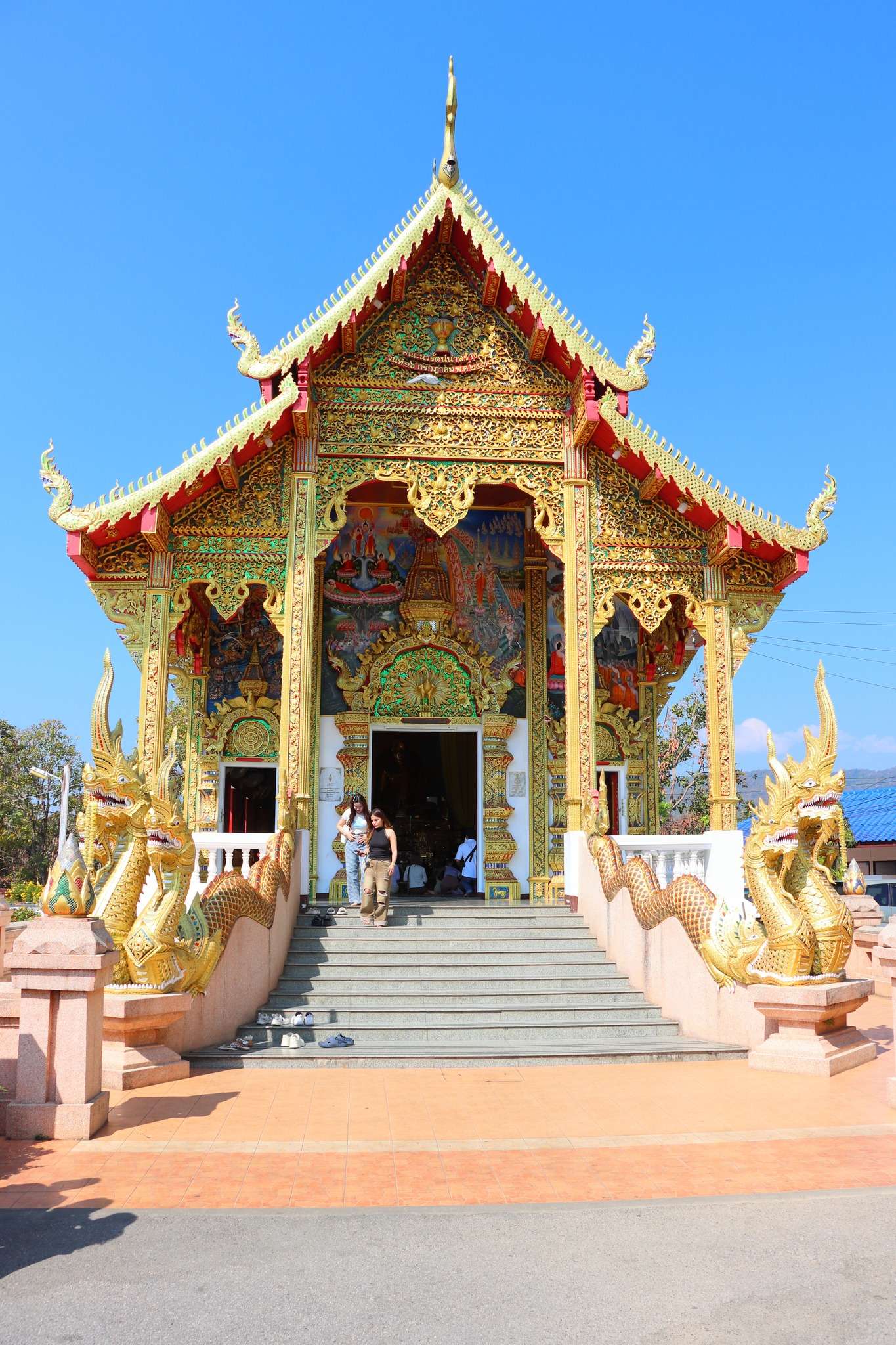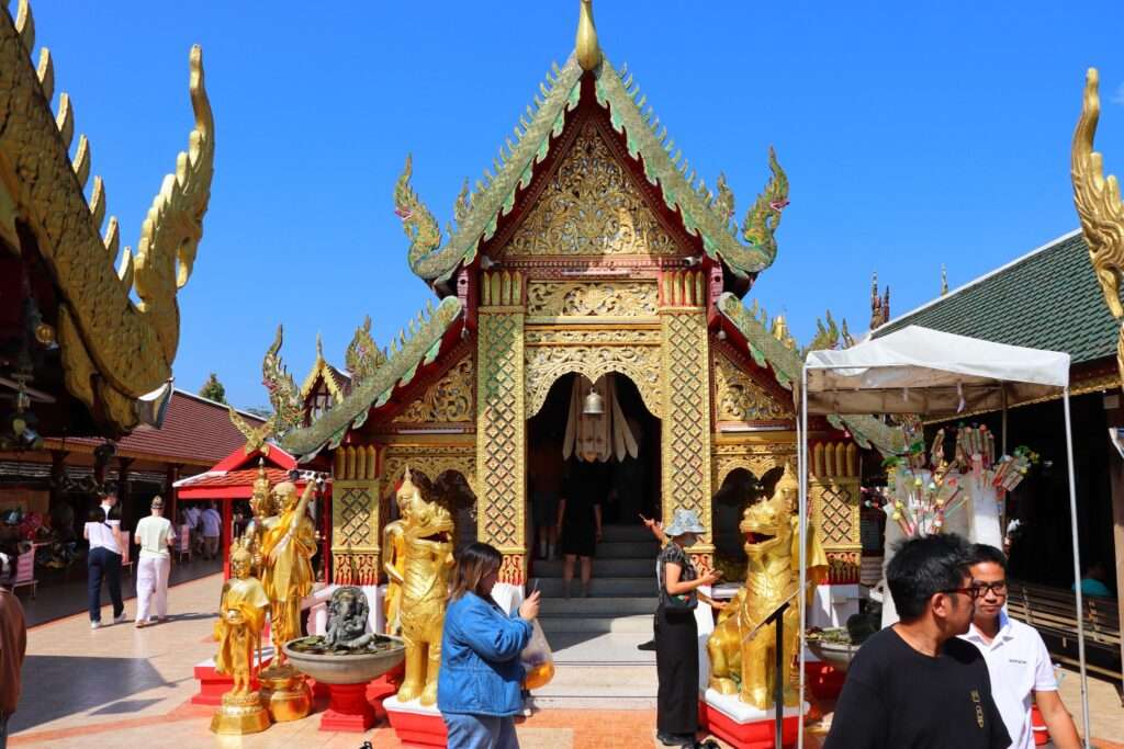 Au sommet, le premier bâtiment qui se dévoile est le Viharn Phra Chao Tan Chai, un pavillon de prière richement décoré qui marque l’entrée symbolique du sanctuaire supérieur. Son architecture est typique du style Lanna tardif : un toit à plusieurs niveaux, soutenu par des colonnes dorées, et un fronton sculpté où s’entrelacent nagas, kinnari et motifs floraux. Les trois nagas monumentaux qui encadrent l’escalier semblent surgir de la pierre pour guider les visiteurs vers l’intérieur. Leur présence n’est pas seulement décorative : dans la tradition Lanna, ils protègent l’accès aux lieux sacrés et rappellent la frontière entre le monde humain et le domaine spirituel.