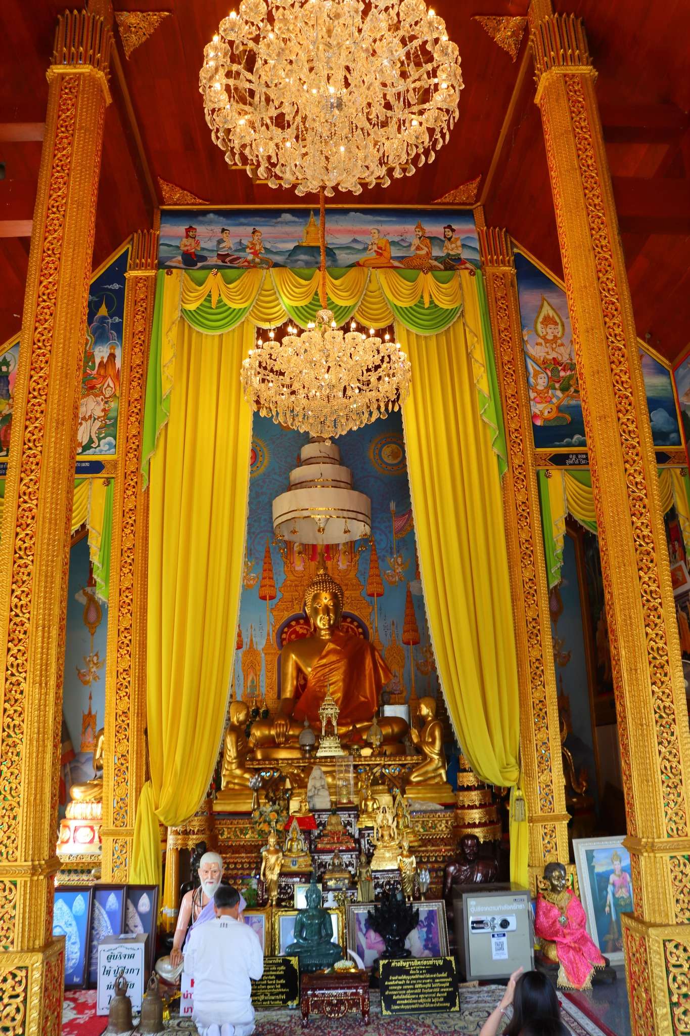 À l’intérieur, le viharn abrite un Bouddha assis en méditation, drapé d’or, entouré de fresques éclatantes qui racontent les vies antérieures du Bouddha, les royaumes célestes et les épisodes fondateurs du Lanna. Les murs sont un véritable livre d’images : scènes de villages, processions, batailles mythologiques, divinités protectrices et paysages cosmiques. Le plafond, orné de motifs étoilés, évoque la voûte céleste. L’ensemble crée une atmosphère dense, presque théâtrale, où l’or, le rouge et le vert se répondent dans un jeu de lumière constant. Les fidèles s’y arrêtent pour allumer un bâton d’encens, faire un vœu ou simplement s’asseoir quelques minutes dans la fraîcheur du pavillon.