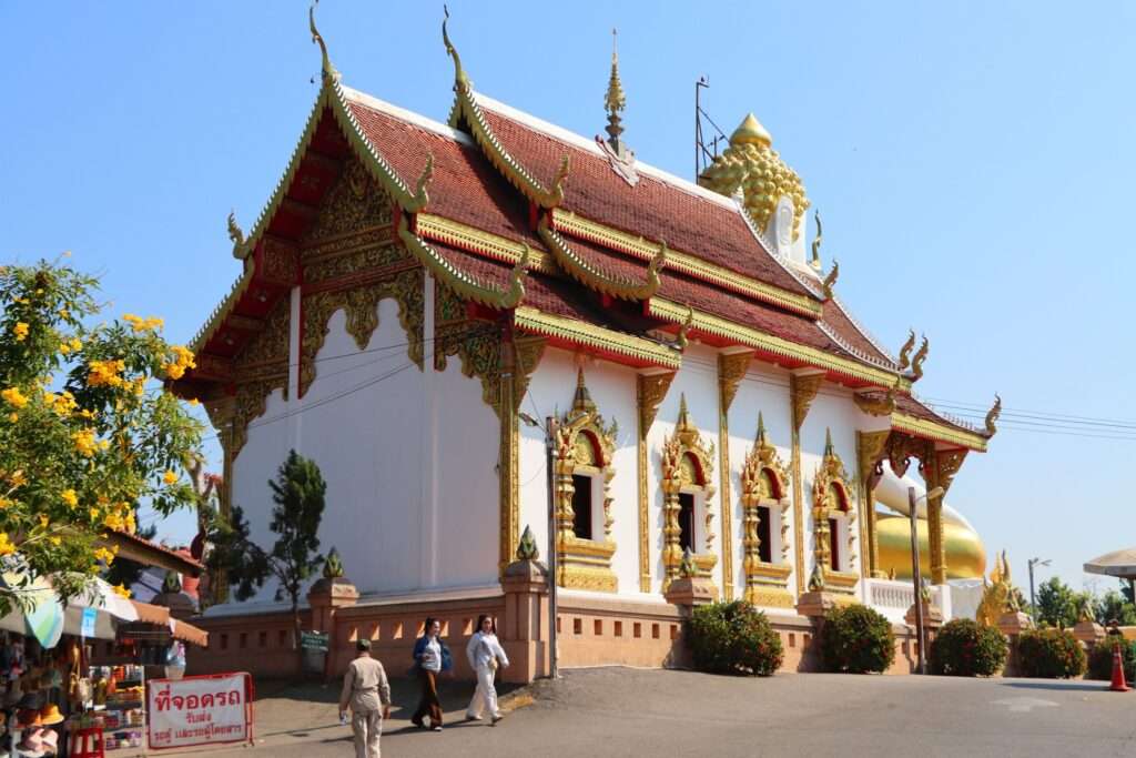 Le Wat Phra That Doi Kham est un exemple remarquable de l’architecture Lanna, enrichie par des restaurations modernes. Le chedi principal, recouvert de feuilles d’or, est le cœur spirituel du site : il abrite la relique et constitue un point de repère visible depuis la ville. Les marches qui y mènent sont encadrées de nagas, serpents mythiques qui symbolisent la protection et guident les fidèles dans leur ascension spirituelle.