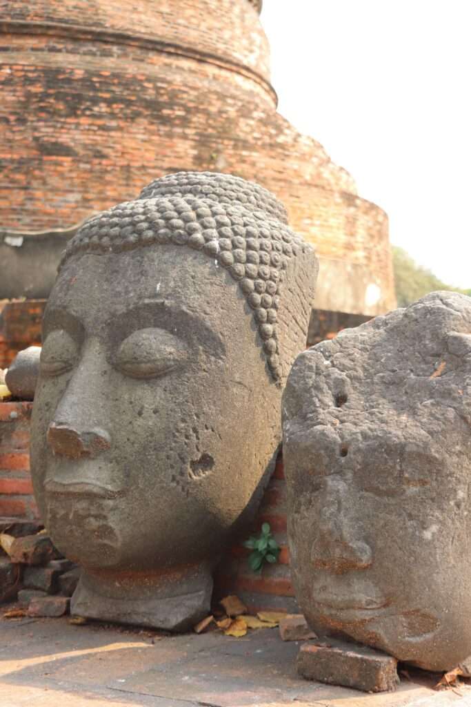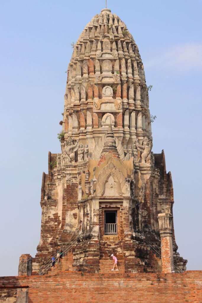 En parcourant les allées du temple, on ressent la superposition des époques : les sculptures érodées, les niches vides, les briques noircies par le temps racontent la grandeur passée du royaume, mais aussi sa fragilité. Le prang, malgré les siècles, conserve une présence presque magnétique. Chaque détail — une moulure, un relief, une fissure — semble murmurer un fragment de l’histoire royale, un souvenir de la foi profonde qui animait les souverains d’Ayutthaya.