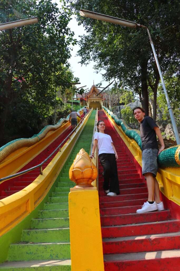 Nous arrivons au pied de la colline à Kanchanaburi, le regard déjà attiré par la silhouette dorée qui domine les rizières du Mae Klong. Le Wat Tham Suea, le Temple de la grotte du tigre, nous attend. Le funiculaire qui facilitait autrefois l’accès est en travaux ; il ne reste que l’escalier aux 157 marches, peint de couleurs vives, qui serpente jusqu’au sommet. Nous décidons de l’affronter pas à pas, et chaque marche devient une transition : nous quittons le monde ordinaire pour entrer dans un espace sacré. La montée est ponctuée de haltes, où nous respirons l’air chaud et humide, tout en contemplant les rizières qui s’étendent comme un tapis vert au pied de la colline.