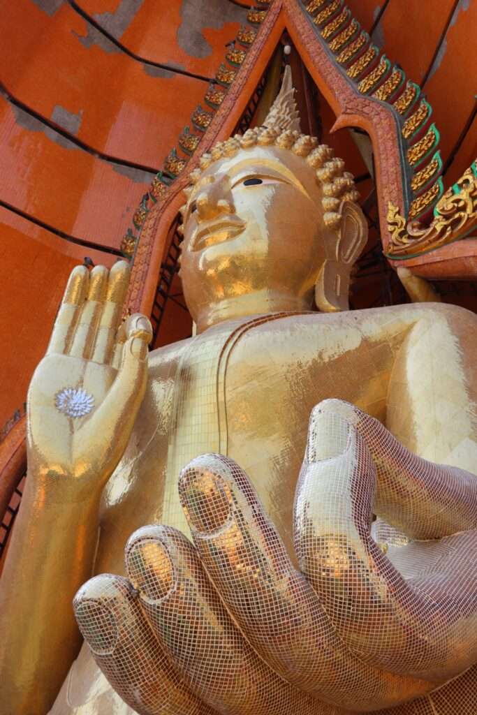 Lorsque nous atteignons le sommet, la première vision est celle du Bouddha géant, assis dans la posture de l’enseignement. Sa main droite esquisse le geste vitarka-mudrā, symbole de la transmission du Dharma. La statue, recouverte d’or et protégée par une structure en forme de pétale, nous domine de toute sa hauteur. Nous ressentons sa présence comme une bénédiction, une force qui enveloppe la vallée entière. Ce Bouddha n’est pas une simple œuvre d’art : il est le maître silencieux qui rappelle que la sagesse éclaire même les plaines les plus ordinaires.