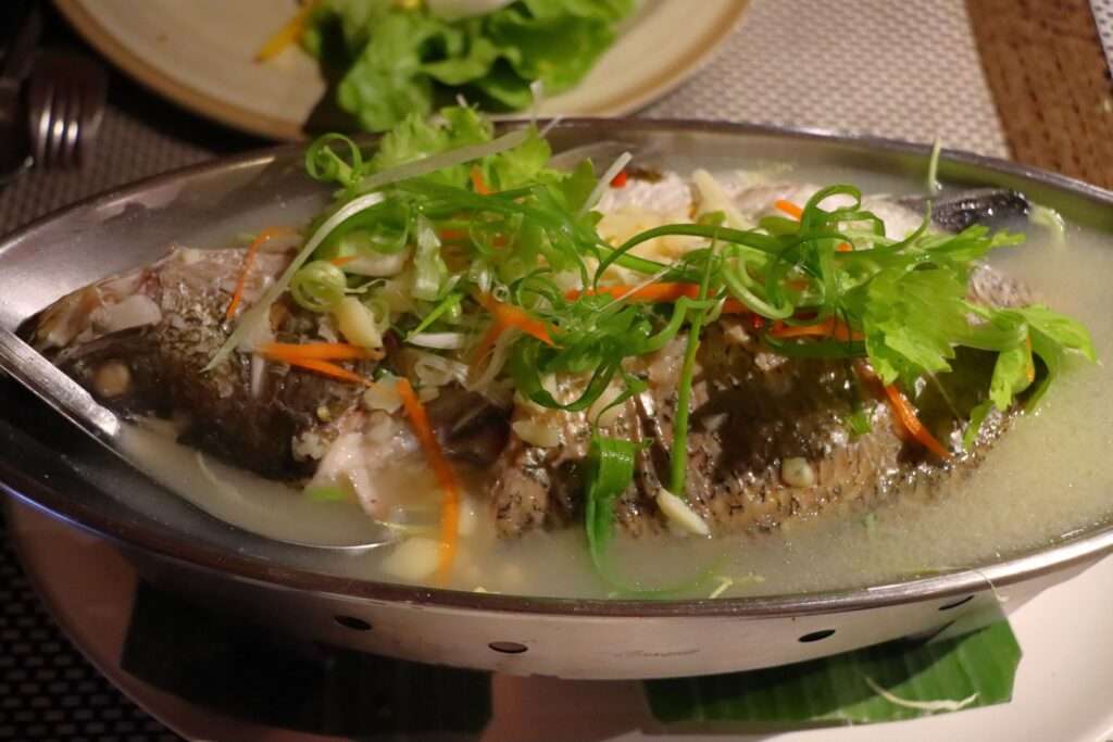 Cette fois, chacun choisit son plaisir. Je me laisse tenter par un Pla Neung Ma-Nao, poisson vapeur à la citronnelle et au citron vert, préparé avec une belle perche locale, pêchée dans les eaux douces de la région. Sa chair est fine, tendre, subtilement relevée par le bouillon parfumé — un plat à la fois léger et tonique, riche en protéines et en oméga‑3, parfait après une journée de marche.