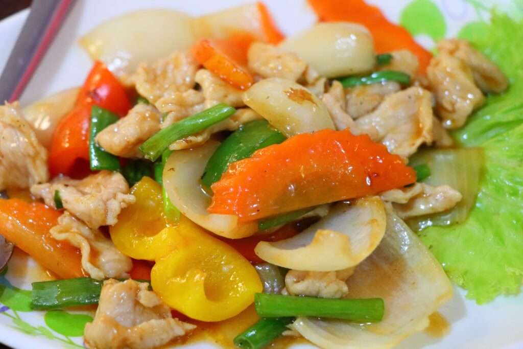 Nadège opte pour un schnitzel croustillant, Margot pour un T-bone généreux, et Bastien choisit un Pad Kuay Teow Chicken, sauté de nouilles larges au poulet, ail frit et légumes croquants. Le poulet provient des élevages locaux, souvent livrés frais le matin même, et les légumes — oignons, laitue, coriandre — viennent des marchés de Kanchanaburi. Ce plat, complet et équilibré, apporte protéines, fibres, vitamines, et cette chaleur familière du wok thaïlandais.
