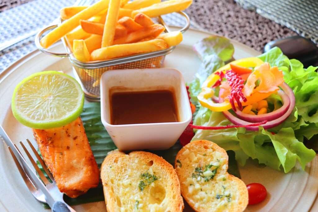 Bastien choisit un Pad Thaï légumes et œuf, simple et parfumé. Margot opte pour un saumon grillé, bien saisi, accompagné de légumes croquants. Nadège craque pour un cheeseburger généreux. Et moi, je me régale avec un Yum TuNa, une salade de thon fraîche et citronnée, relevée juste ce qu’il faut.