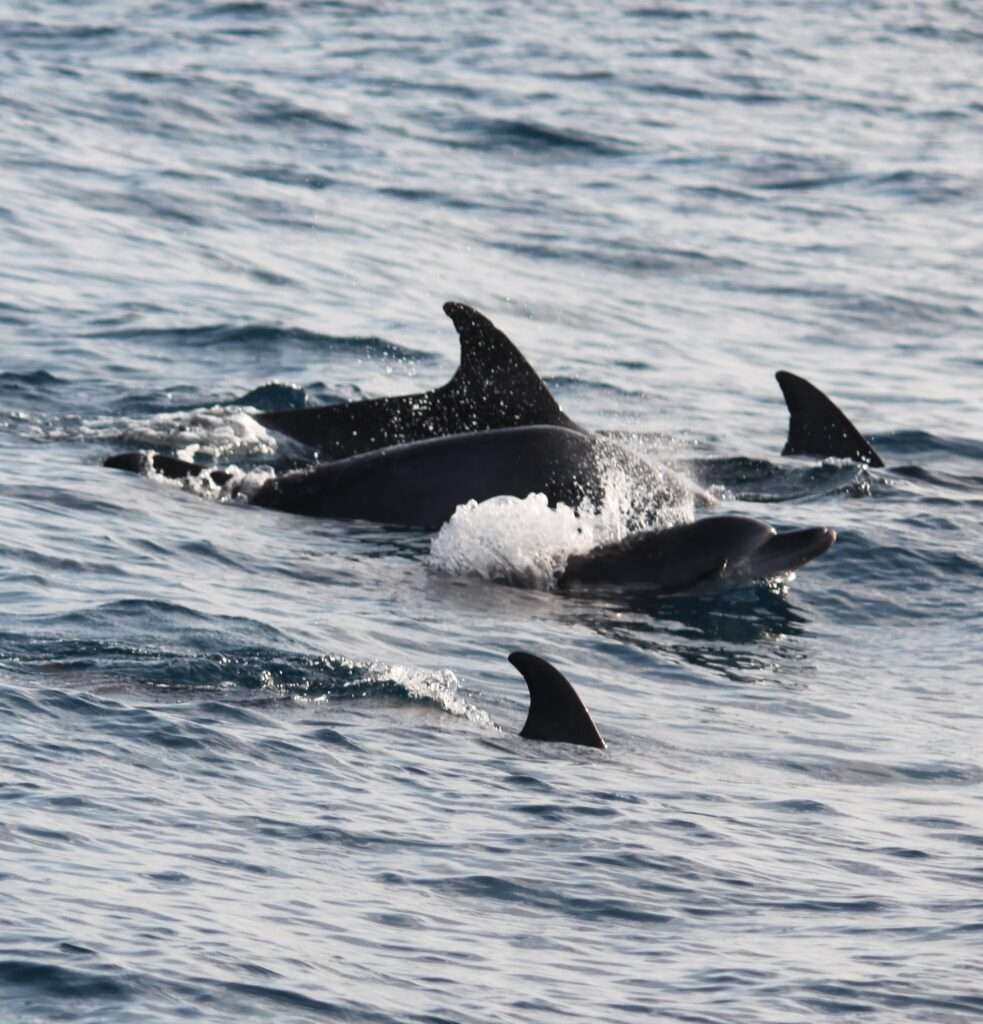 À peine sortis du lagon, l’horizon s’ouvre sur un miroitement infini. Le moteur vrombit, puis soudain, à tribord, un éclat argenté fend la surface. Un dauphin bondit, un deuxième, puis un troisième. La scène est brève, mais saisissante : quelques secondes suspendues entre l’eau et le ciel. L’équipage coupe le moteur, et nous restons là, à la dérive, dans le silence ponctué par les souffles des cétacés. Leurs silhouettes grises glissent à quelques mètres, parfois si près que l’on distingue la texture lisse de leur peau.