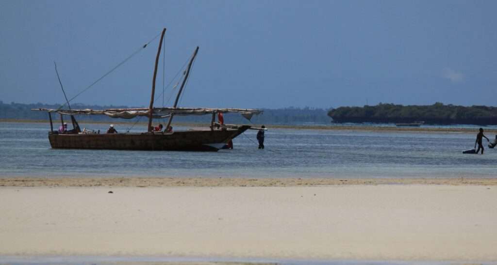 Notre dhow reprend sa route vers un banc de sable immaculé. La mer s’ouvre sur une langue blanche, fine comme un ruban, que les marées font apparaître et disparaître chaque jour. Nous débarquons pour un moment suspendu : baignade, marche pieds nus, contemplation d’un horizon sans limite. En face, on distingue les petites îles coralliennes de Miwi et de Kwale, posées sur la mer comme des perles. C’est sur cette dernière que nous ferons halte pour le déjeuner.